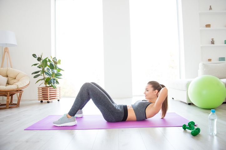 仰臥起坐也就是Sit-up,不過想舒緩坐骨神經痛,就可以稍為改變Sit-up的做法。方法是平躺在地上,然後雙膝屈曲成90度,雙手在胸前交叉,再利用腹部的力量抬起上半身,一共進行10次。
